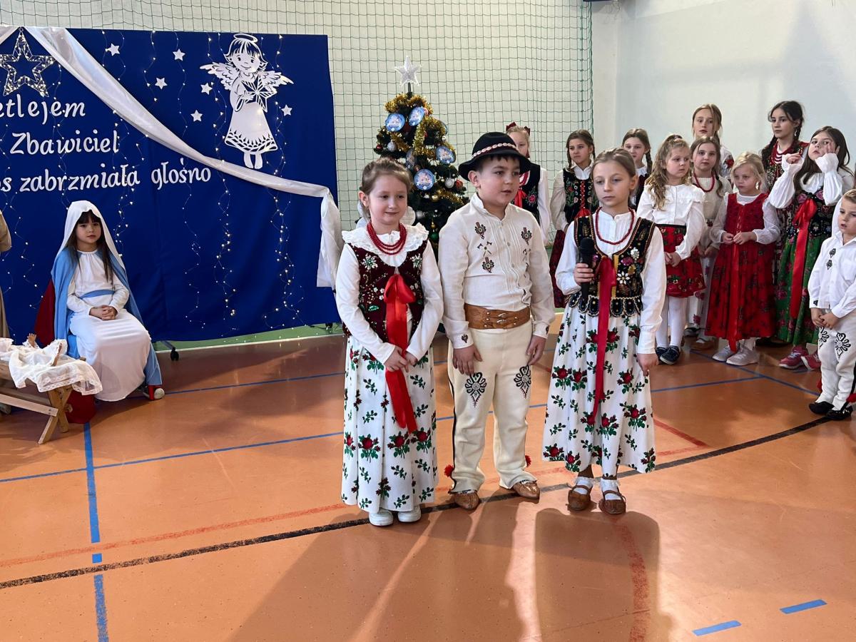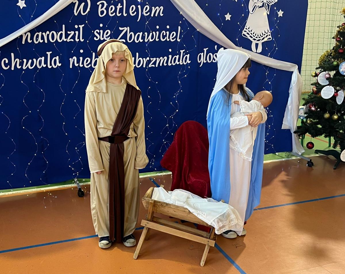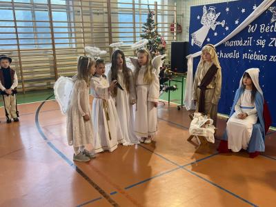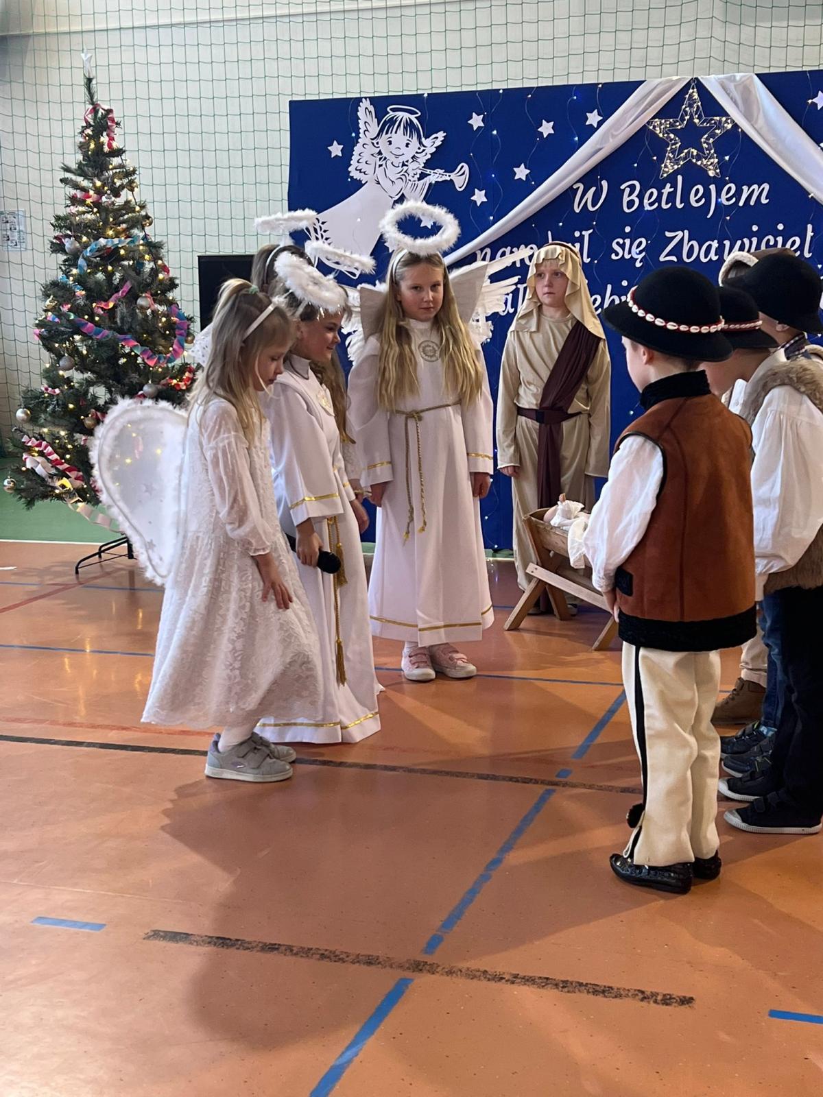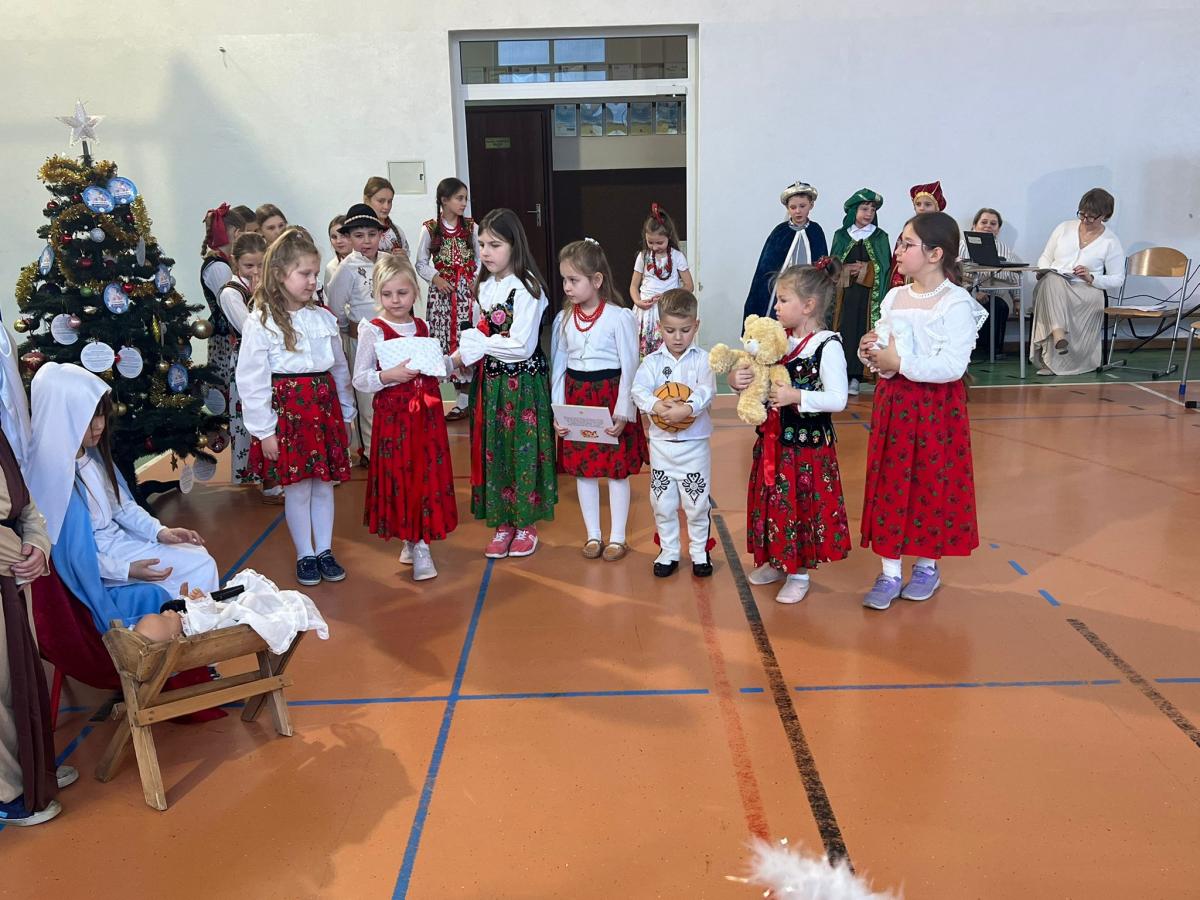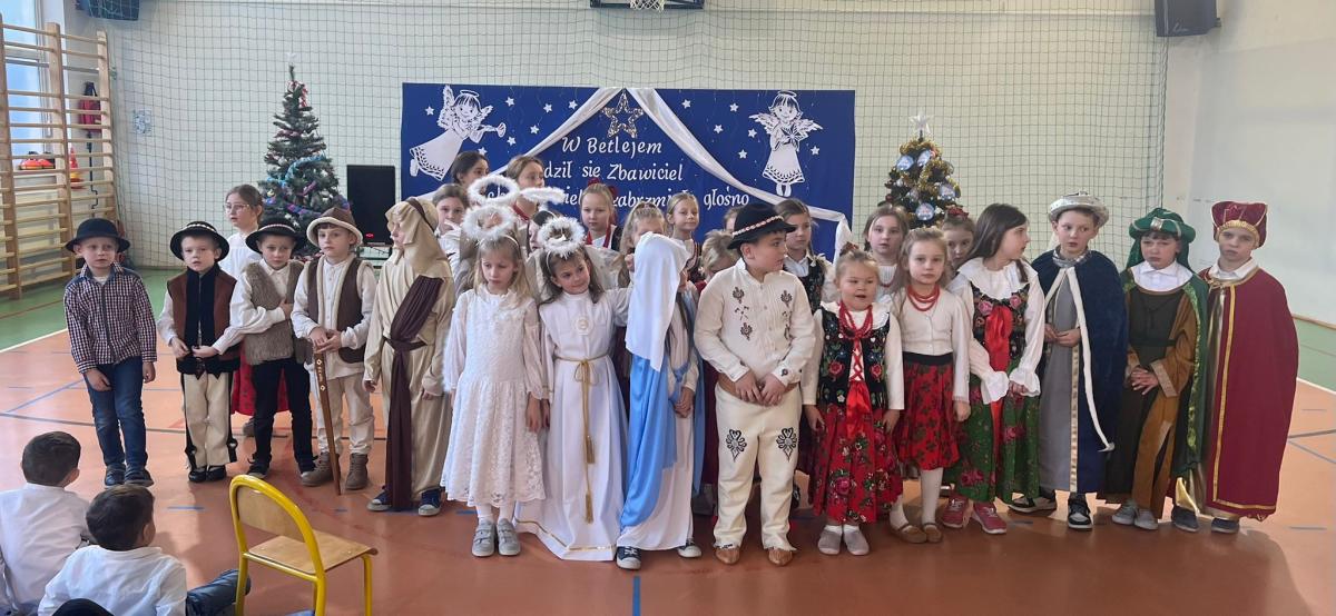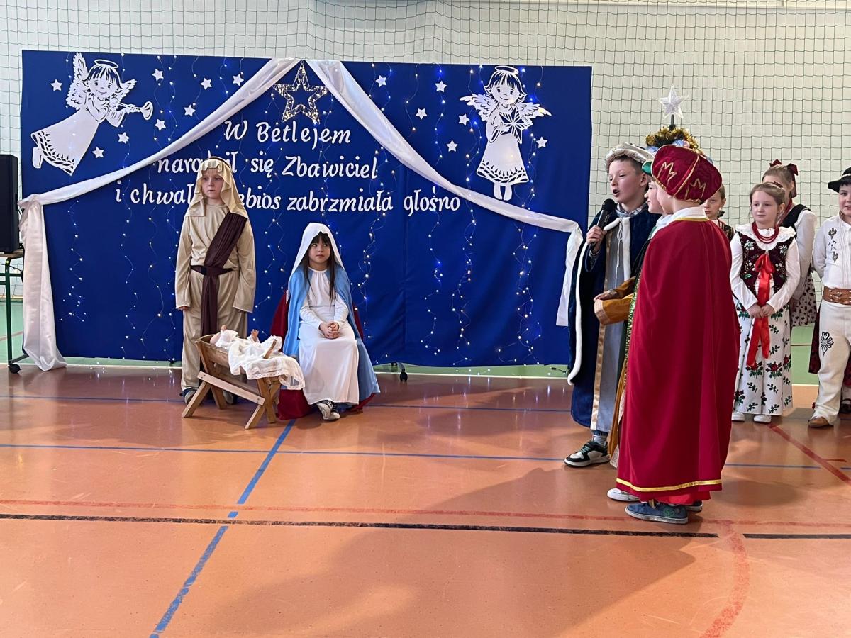 Ciszę betlejemskiej Nocy i radość Narodzin przeżywaliśmy 19 grudnia 2025 roku,  kiedy to uczniowie naszej szkoły z ogromnym zaangażowaniem wcielili sięw swoje role. Przypomnieli w ten sposób wydarzenia sprzed ponad dwóch tysięcy lat, kiedy to w Betlejem narodziło się Boże Dzieciątko. Dzieci wcieliły się w role Maryi i Józefa, pasterzy i aniołów, trzech króli, przybywających złożyć pokłon Jezusowi narodzonemu w ubogiej stajence. Świetności inscenizacji dodały kolędy i pastorałki, które napełniły wszystkich świąteczną radością i sprawiły, że poczuliśmy magię zbliżających się świąt.