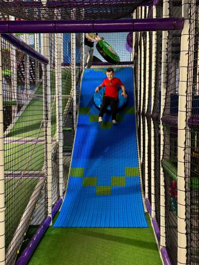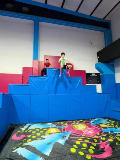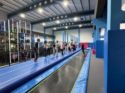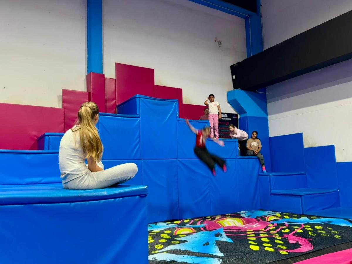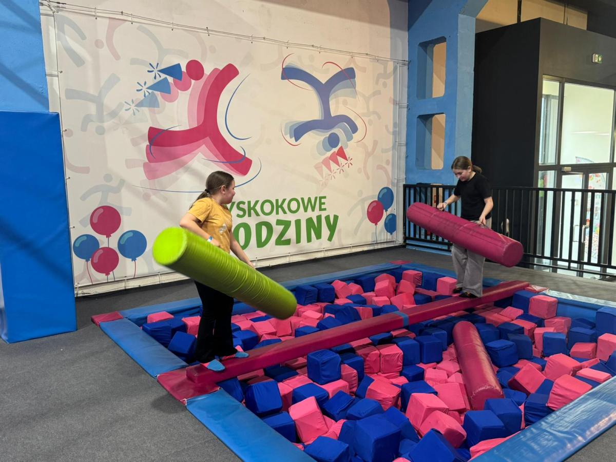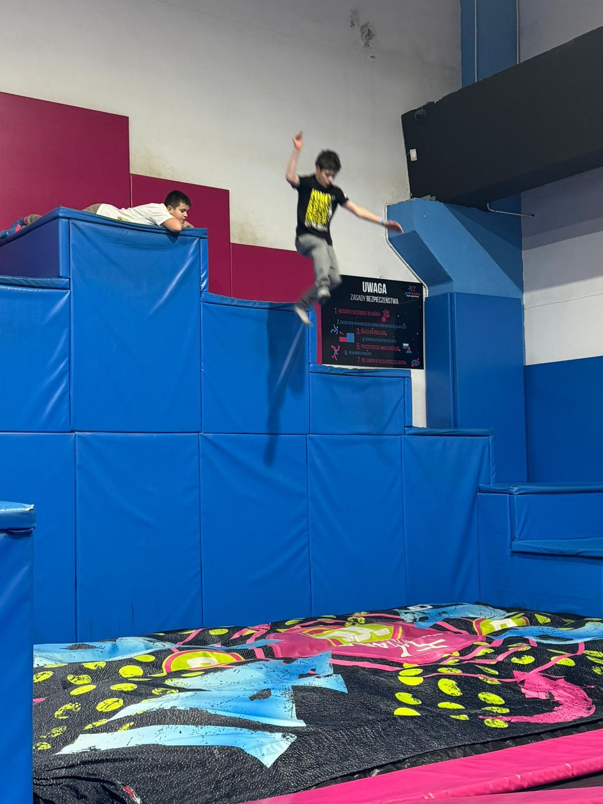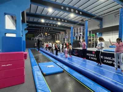 Po przyjeździe do parku trampolin uczniowie zostali powitani przez instruktorów i przeszli krótkie szkolenie z zasad bezpieczeństwa obowiązujących na terenie obiektu. Następnie wszyscy założyli skarpetki antypoślizgowe i rozpoczęli zabawę.